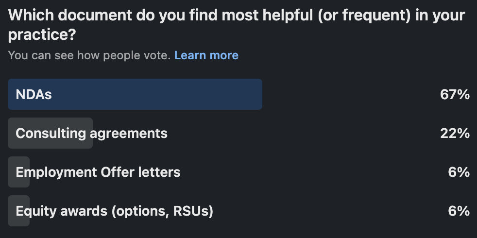 To build this automation in the most valuable way, I conducted a LinkedIn poll on 12/19/2022 for 24 hours. I asked my network to pick the most helpful/frequent document in their practice.