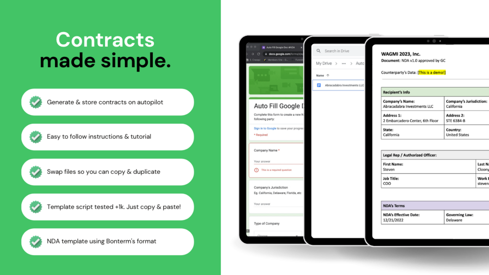 You'll get an easy to implement automation guide and downloadable templates to easily generate NDA documents without development skills. All of this is possible using FREE tools like Google Workplace products that you already have --> Total Value of +$790!!